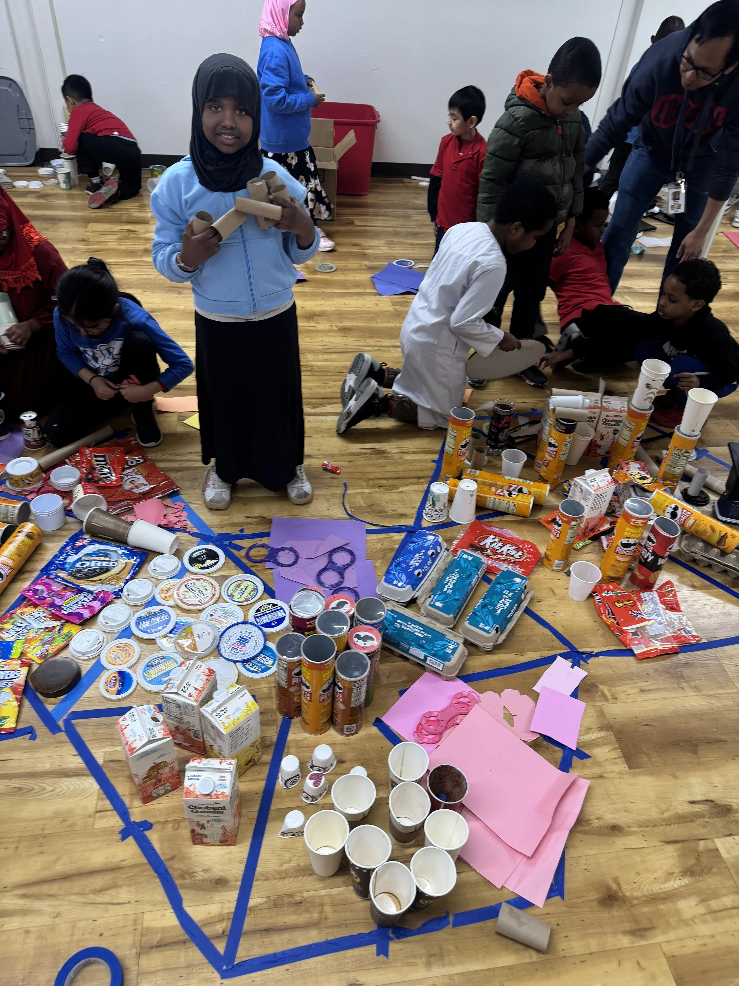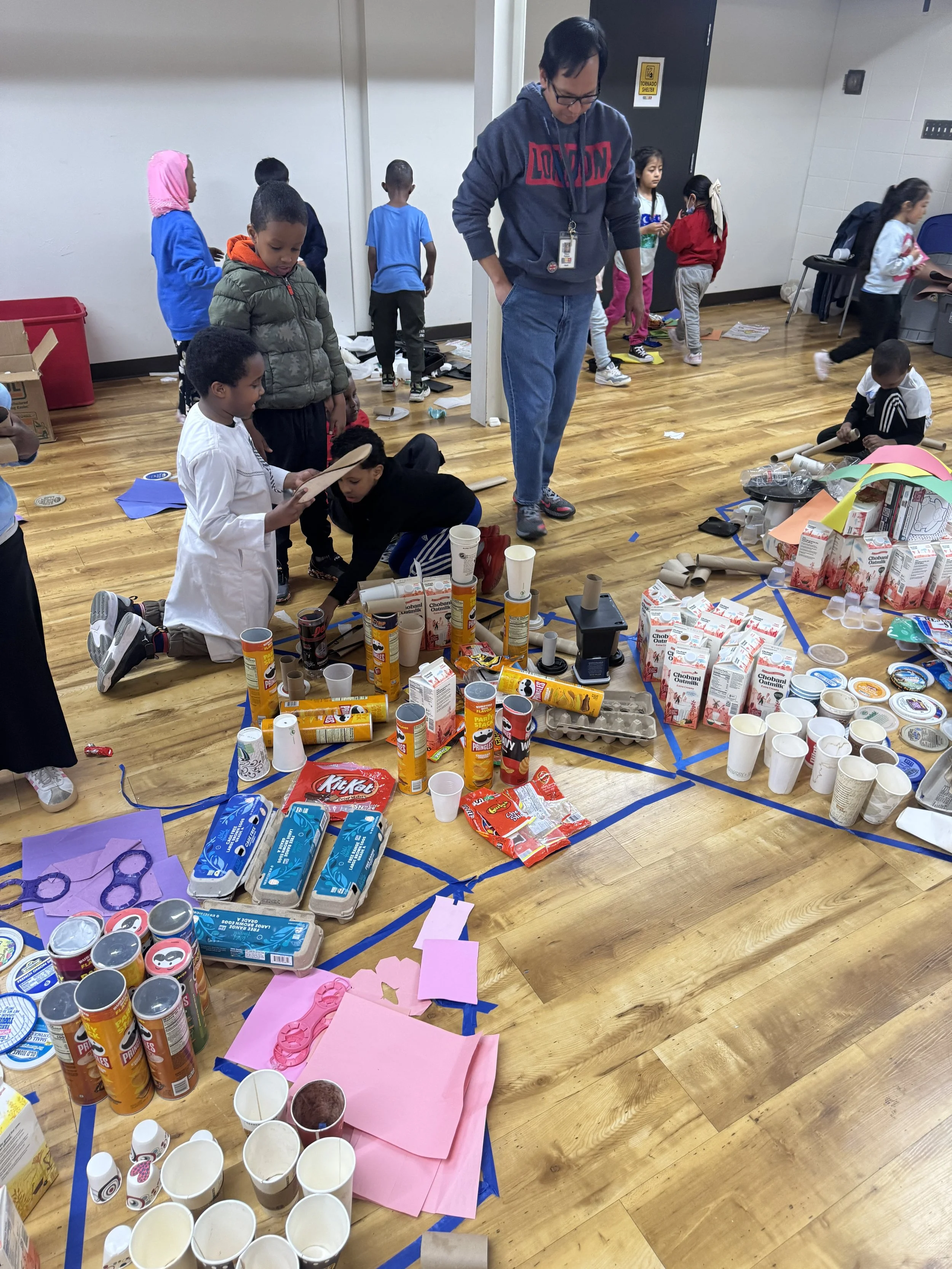 The next two phases of this collaboration involved recycled-object toy-making with the elementary students. For a long time we had been hoping to do a project with K-4 that involved individual, take home creations. We settled on recycled-object toy-making: a popular make-and-take project I devised over twenty years ago. I have worked with grade school students several times on this project over the years, mostly with the elementary students at Northside in St. James MN, but it has been several years since I last conducted a session and I was excited to return to it and refine the process for this group. We began with the third graders. We had worked together in 2024 on the Springboard collage project, and they were excited to make something they could take home that day!