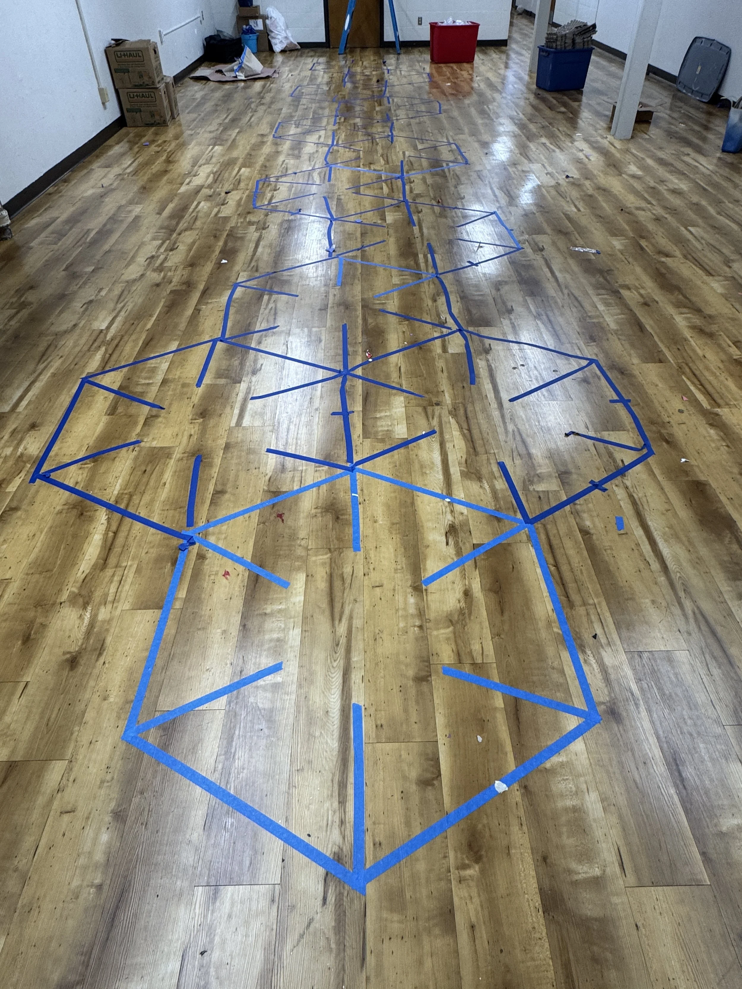 First grade completed their composition first, then helped us remove and reorganize the materials for Kindergarten. The primary challenge with this age of students is enthusiasm! Visual coherence started to give way at the half-way point in favor of piling more materials-on. Organization will be key to pursuing this sort of project with this age group. Out of an abundance of caution and due to our tight schedule, we left the tape pattern intact for the Kindergarden students to re-use. Emptied as it is above, you can see what a good job the students did making the pattern!