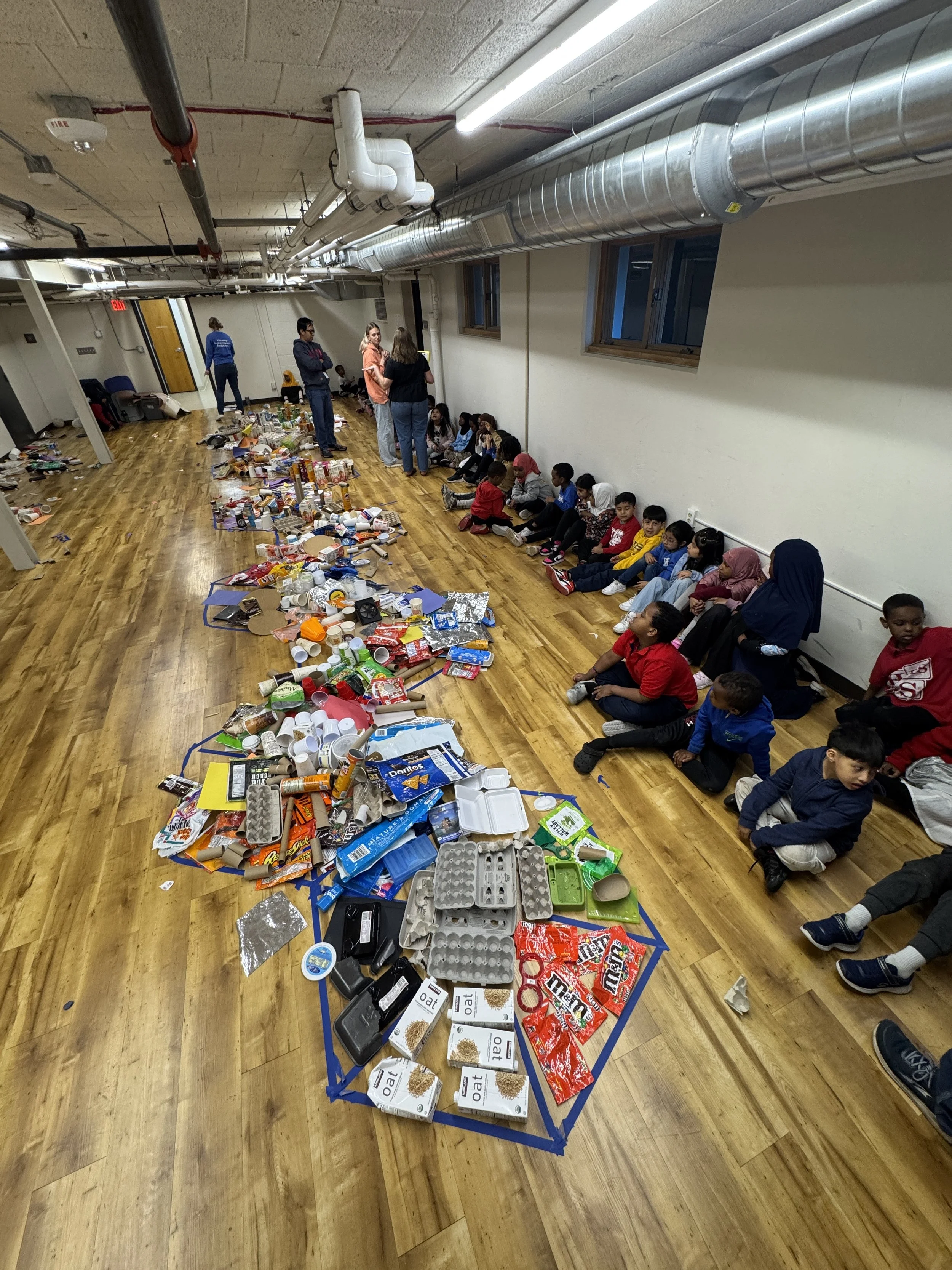 In December of 2025 we reconvened in the gym to create the interior collages. Students arrived with several boxes of post-consumer materials that they had been collecting throughout the fall. I also provided objects from my own vast store of post-consumer materials, many from my own consumption, some from previous collaborations. We negotiated the excitement and chaos of dividing up shared materials equally among students.
