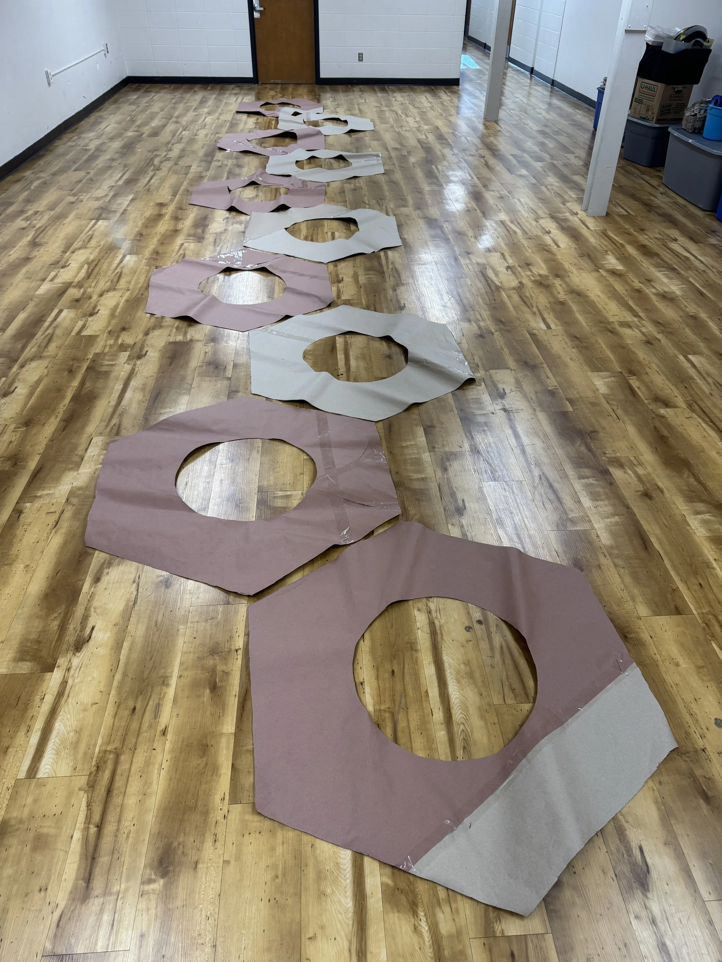 Based on my past success writing and receiving a series of State Arts Board Individual Artist grants, it fell to me to write the grant. It was an exciting new opportunity, as I had never written an Art Experience grant. Unlike an Individual Artist grant, which funds an artists personal activities and creations, the Art Experience grant focuses on creating an creative experience for a group of Minnesotans. I had some familiarity with how these grants might be assessed, having served on the panel that chose art education grants. I carefully reviewed the application criteria, created the essential design for the three projects, wrote the grant and revised it in collaboration my Hennepin peers and their needs, and submitted it. In the spring of 2025 the grant was successfully funded! The next step in the process was to begin designing the projects in detail. Arts Experience grants provide unique creative experiences: in my case, I bring reuse and recycled art making projects that are not part of a school’s normal art curriculum. We knew we wanted to begin the year with another Tessellation Project. Since 2017 I have worked with a wide range of collaborators on these patterned, wall based works. Each consists of a series of conserved paperboard packaging ‘cells’—small boxes in a shape that, when combined with other cells, creates a pattern. Collaborators build the cells, then populate their interiors with a recycled-object 3D collages. These populated cells are then hung on the wall of a space to form a large low-relief patterned mural. This would be my 4th collaboration with Hennepin students on a tessellation project, and each employed a unique pattern. For this version, we wanted to incorporate a reference to the schools two mascots—The Hornet and the Honey Bee—by using a hexagon shape that references a hive formation. I began this process as I usually do: by hand-constructing a prototype in paper, then paperboard: